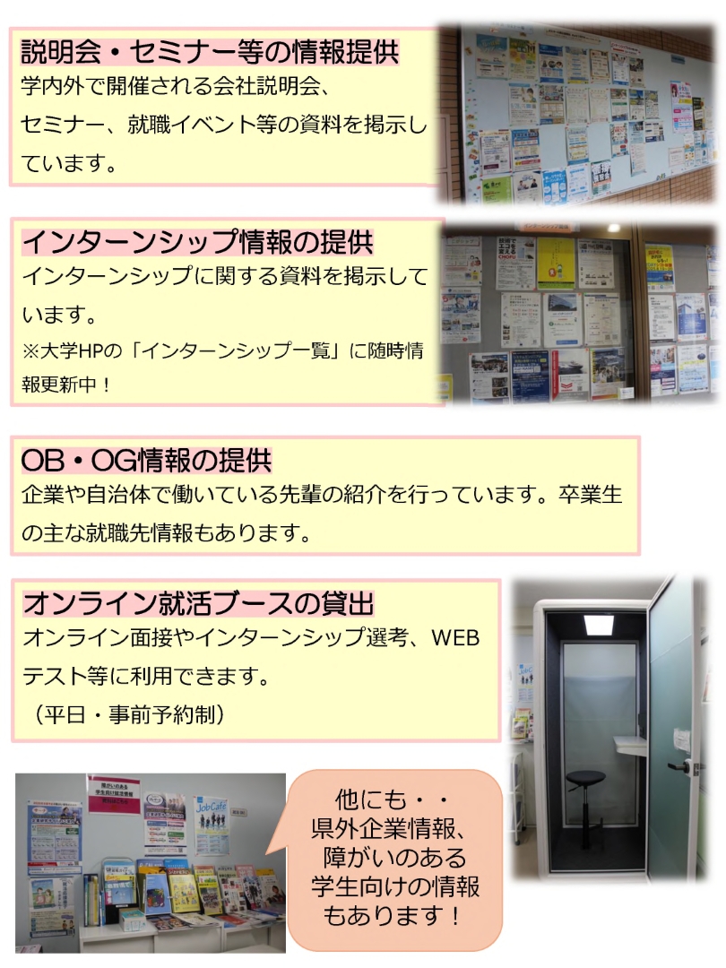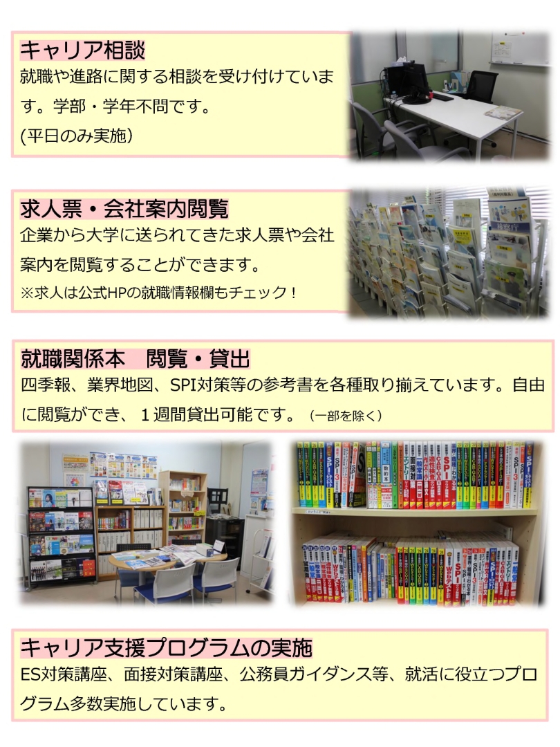 キャリア支援室について ホーム キャリア支援室について キャリア支援室について キャリア支援室 キャリア支援室では相談員(国家資格キャリアコンサルタント)とのキャリア相談や 模擬面接練習をはじめ、就職に役立つ本の貸し出しなど、様々な就活生のサポートを行っています。