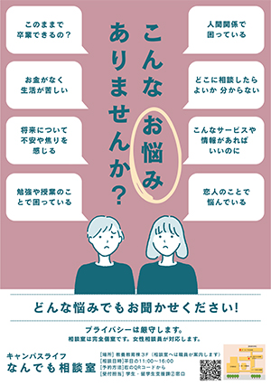 学生支援センターには、学生のあらゆる相談に応じるため、ワンストップ窓口として「キャンパスライフなんでも相談室」を設置しています。